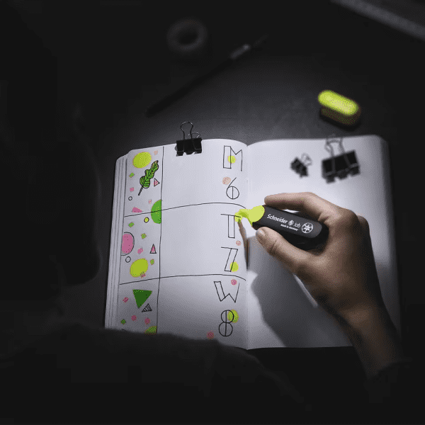Surligneur avec pointe biseautée pour deux épaisseurs de trait d'écriture, 1+5 mm. Le surligneur Job est le premier surligneur fabriqué à partir de plus de 90% de matériaux recyclés à recevoir le label écologique mondialement connu « Blauer Engel » (Ange Bleu). Le corps, le réservoir à l'intérieur et la pointe sont en plastique recyclé. L'encre est bio-basée. Encre universelle pour papier normal, photocopie et fax qui offre une luminosité maximale et qui est résistante à la lumière, le surligneur Job est recommandé pour l'école, pour l'université ou pour bureau et, grâce à sa pointe biseautée, il est également parfaitement adapté pour les travaux créatifs dans le bullet journal ou pour la calligraphie dans le cadre du handlettering. Il est rechargeable avec la station de recharge Maxx 660. Sa grande réserve d'encre permet au surligneur Job de marquer plus de 15 000 mots.
