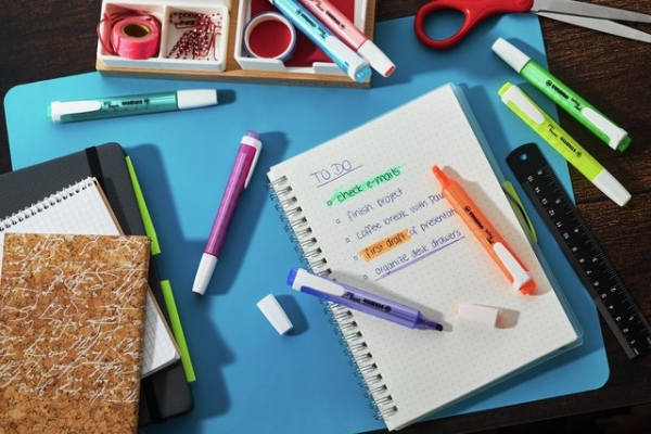 Etui de 6 surligneurs assortis. Stylo-fluo avec clip et pointe biseauté. biseautée 1/4 mm. Couleur : jaune , bleu , vert, orange, pink.