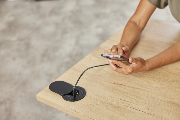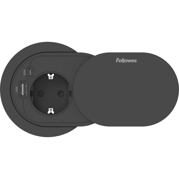 Prise de bureau discrète et encastrée. S'installe dans tout obturateur de bureau de 60 mm ou 80 mm. Couvercle coulissant dissimulant les prises lorsqu'elles ne sont pas utilisées. Prise de courant 230V, 1 port USB-A (18 W max), 1 x port USB-C (30 W max). Câble d'alimentation de 2 mètres. Prise Type F pour Luxembourg et Allemagne.