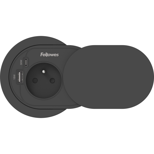 Prise de bureau discrète et encastrée. S'installe dans tout obturateur de bureau de 60 mm ou 80 mm. Couvercle coulissant dissimulant les prises lorsqu'elles ne sont pas utilisées. Prise de courant 230V, 1 port USB-A (18 W max), 1 x port USB-C (30 W max). Câble d'alimentation de 2 mètres. Prise Type pour France et Belgique.