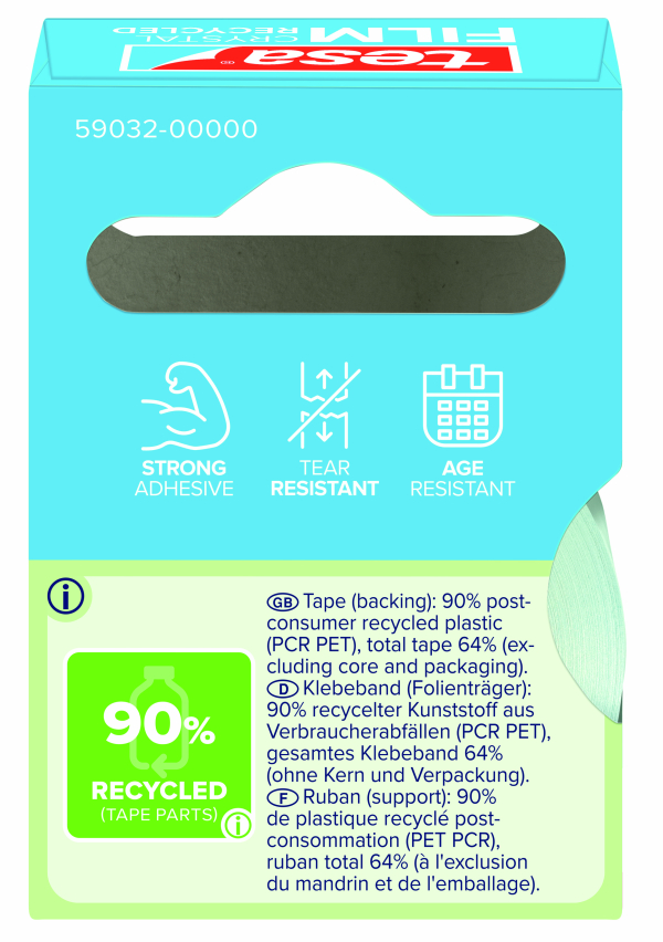 Tesafilm crystal recycled. Ruban adhésif 10M x19MM transparent. Ruban adhésif transparent avec une forte adhérence. Idéal pour coller, emballer, fixer, décorer ou réparer. Un ruban adhésif transparent et fiable, invisible sur la plupart des surfaces. Contribution durable de 90 % de déchets post-consommation. Sans solvant