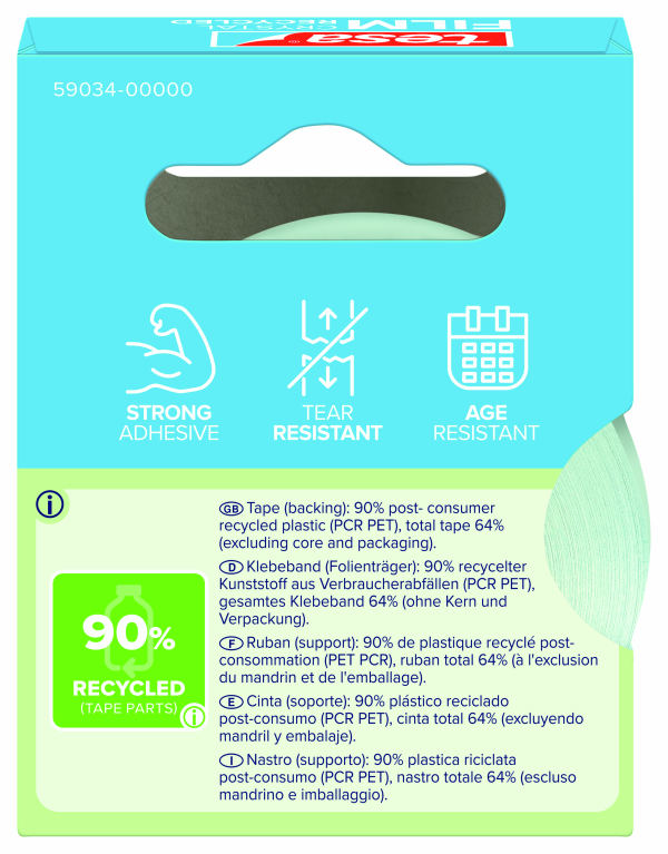 Tesafilm crystal recycled. Ruban adhésif 33M x19MM transparent. Ruban adhésif transparent avec une forte adhérence. Idéal pour coller, emballer, fixer, décorer ou réparer. Un ruban adhésif transparent et fiable, invisible sur la plupart des surfaces. Contribution durable de 90 % de déchets post-consommation. Sans solvant