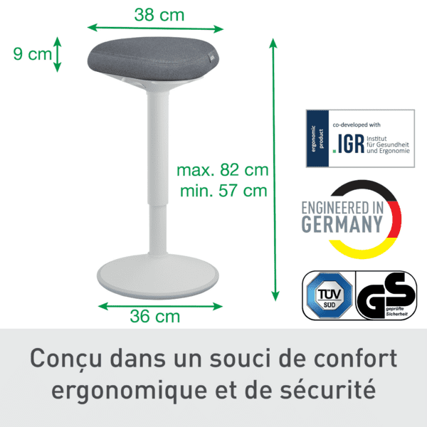 Tabouret ergonomique debout ( 57-82 cm) doté d'une assise confortable en mousse double densité et d'un support ergonomique ferme. Couleur : Gris clair. Grâce à sa forme triangulaire, l'assise répartit le poids uniformément sur le bassin et le rembourrage mousse permet de réduire la pression sur les cuisses et les jambes. Peut être utilisée penchée ou complètement assis, ce qui encourage à se tenir plus droit. Règlage facile de la hauteur allant de 57 à 82 cm. La housse du siège est fabriqué avec des matériaux 100% recyclés. Conforme à la norme DIN 26800 EN ISO 15537. Certifié TUV et GS pour la sécurité.