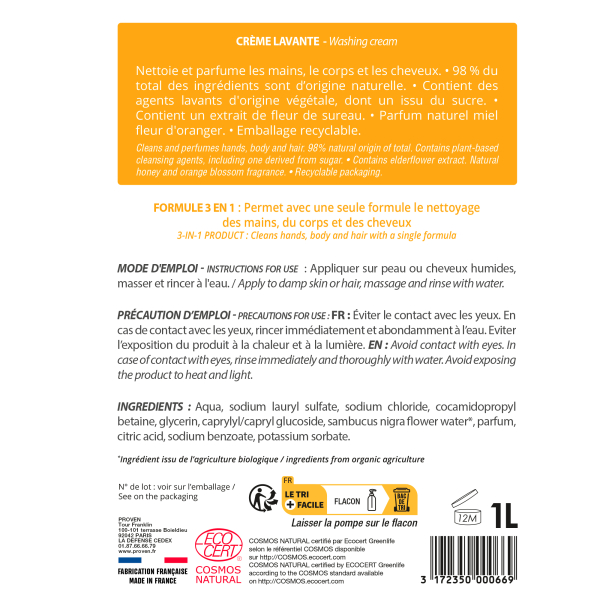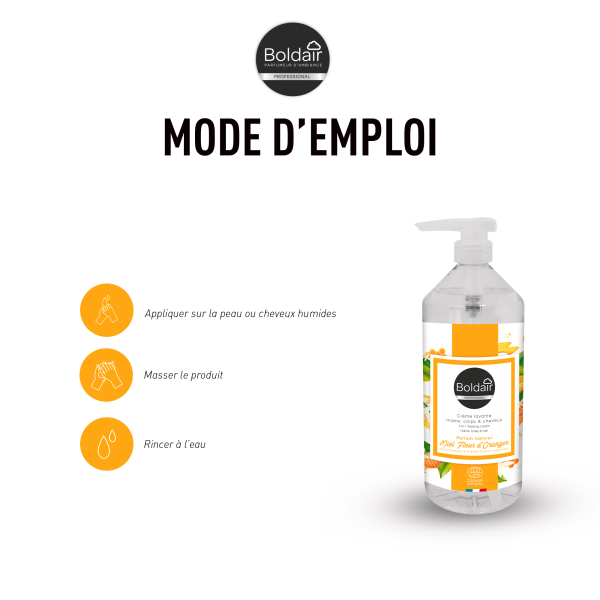 Le savon liquide Boldair Miel Fleur d'Oranger en flacon de 1 L est une solution d'hygiène pratique et polyvalente grâce à sa formule 3 en 1, adaptée au lavage des mains, du corps et des cheveux. Composé à 98 % d'ingrédients d'origine naturelle, il associe douceur et efficacité tout en respectant la peau. Enrichi en extrait de fleur de sureau reconnu pour ses vertus adoucissantes, il laisse la peau douce et agréablement parfumée. Idéal pour une utilisation quotidienne, il convient aussi bien aux zones de production qu'aux hôtels, bureaux, collectivités ou à la maison.