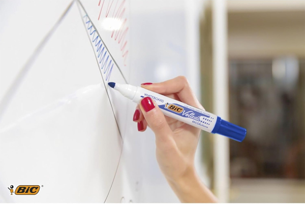 Marqueur pour tableau blanc effaçable à sec à faible odeur. Pointe bloquée: ne se plie pas, ni se rétracte sous la pression. Très facile à effacer. Pointe ogive en acrylique de 4.9mm pour une largeur de trait de 1.4mm. Fabriqué à partir de 51% de matériaux recyclés à l'exception du système d'encre. Fabriqué en Europe.