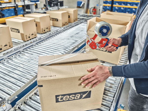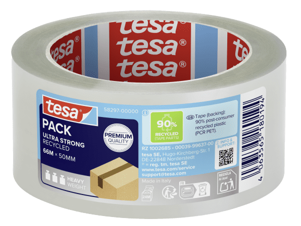 Tesapack Ultra STRONG RECYCLED est un ruban adhésif d'emballage en PET recyclé composé d'un support à 70 % de PET recyclé post-consommation et d'un adhésif acrylique à base d'eau. Ce ruban adhésif d'emballage présente un support solide doté d'excellentes propriétés mécaniques et d'une masse adhésive acrylique, offrant ainsi la solution parfaite pour les applications d'emballage de poids moyens et lourds jusqu'à 30 kg. Le déroulement du ruban est facile et rapide.