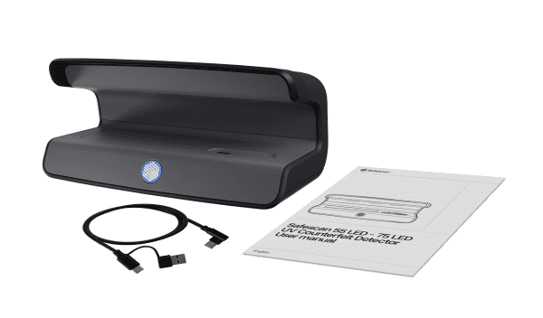 Protégez votre entreprise contre les contrefaçons. Le Safescan 55 LED offre la détection UV la plus puissante à ce jour. Vous pouvez ainsi vérifier les billets de banque, les cartes de crédit, les passeports, les permis de conduire et autres documents d'identification en toute confiance. Un détecteur puissant qui, grâce au capteur de mouvement automatique, est toujours prêt à l'emploi lorsque vous en avez besoin. Alimenté par USB-C. Livré avec convertisseur USB-A. Dimensions: 17.1 x 9.1 x 8.2 cm. Garantie 3 ans.