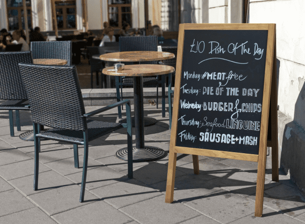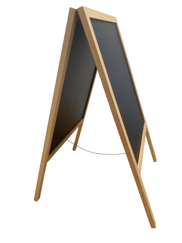Ce chevalet stop trottoir Exacompta avec son cadre et pieds en pin est idéal pour afficher vos menus, inscrire un message ou un prix visible de tous à l'éxtérieur comme à l'intérieur. La partie ardoise en MDF permet une écriture soignée avec une craie ou un feutre craie. Nettoyage facile à l'aide d'un chiffon humide pour ne laisser aucune trace. Ce produit est pliable sans effort ni danger avec sa chaîne de sécurité et permet un rangement peu encombrant. Solide et stable mais pourtant relativement léger, il peut être déplacé facilement. Cette ardoise ne nécessite aucun montage. Usage intérieur et extérieur . Il est conseillé de mettre le produit à l'abri en cas d'averses. Dimensions: 53 x 90cm. Poids: 5kg.